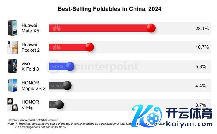 Counterpoint Research也公布了各品牌的畅销机型,华为Mate X5是最受接待的大折叠手机,占据28.1%的商场份额,华为Pocket 2则是小折叠的王者,商场份额10.7%。光是这两款机型,就占据了总销量的38.8%。