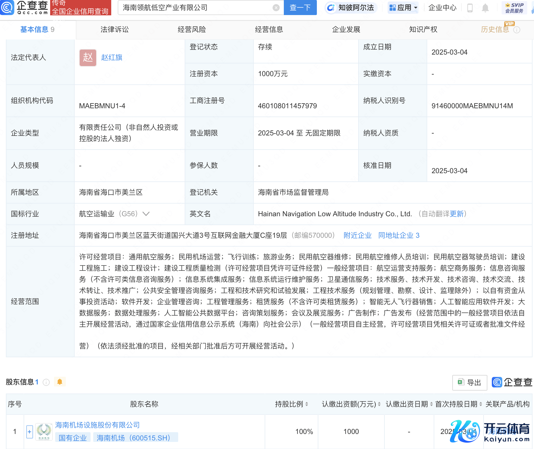 企查查APP露出,近日,海南领航低空产业有限公司树立,法定代表东谈主为赵红旗开云体育,注册成本1000万东谈主民币,主义畛域包括通用航空劳动、民用机场运营、遨游检修、旅游业务、航空运营相沿劳动等。企查查股权穿败露出,该公司由海南机场(600515)全资执股。